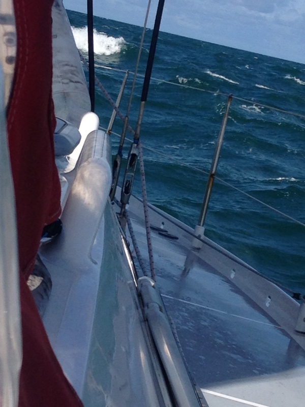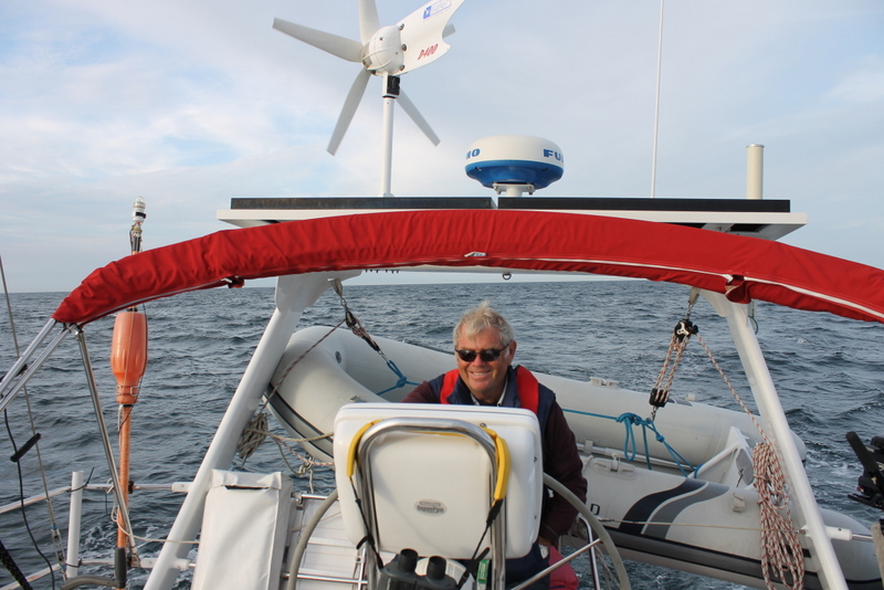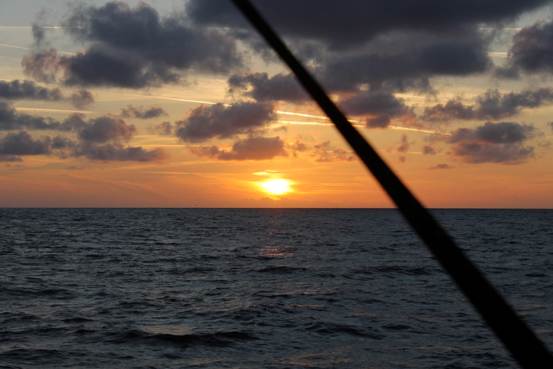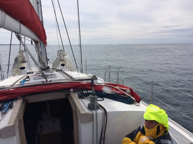 We left Boulogne in a fleet of dozens of yachts, perhaps fifty in total, all heading east in more clement but still breezy conditions, broad reaching round le Cap Gris-Nez in calm seas in sight of both coasts – French & British – and then dead downwind past Calais and up the last stretch of northern French coast. Whilst some, including Lady Marron, our new Allures friends, hived off into Dunkerque, we carried on first goose-winging then with poled out genoa with the others up through the very busy Dunkerque channel into Belgium.