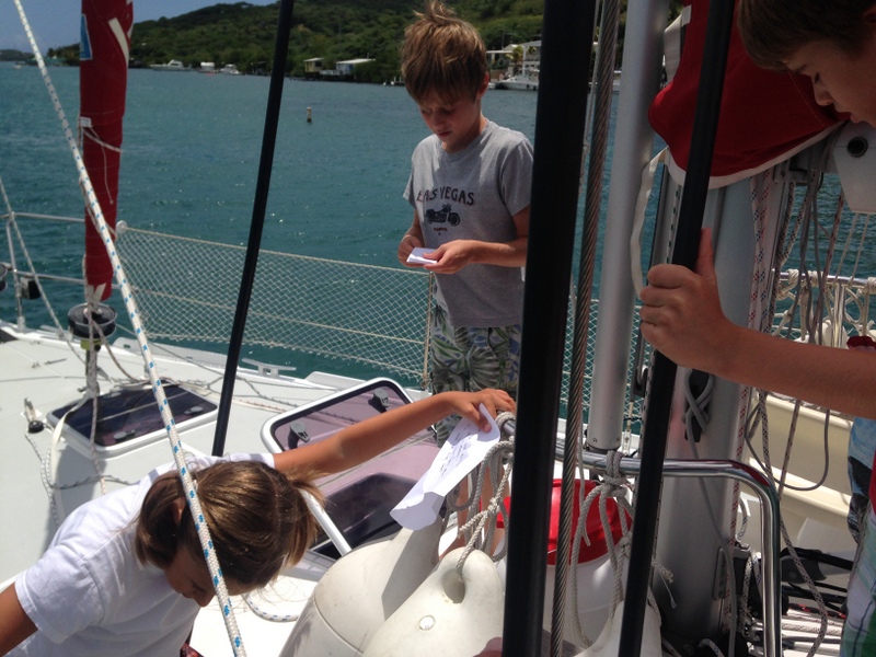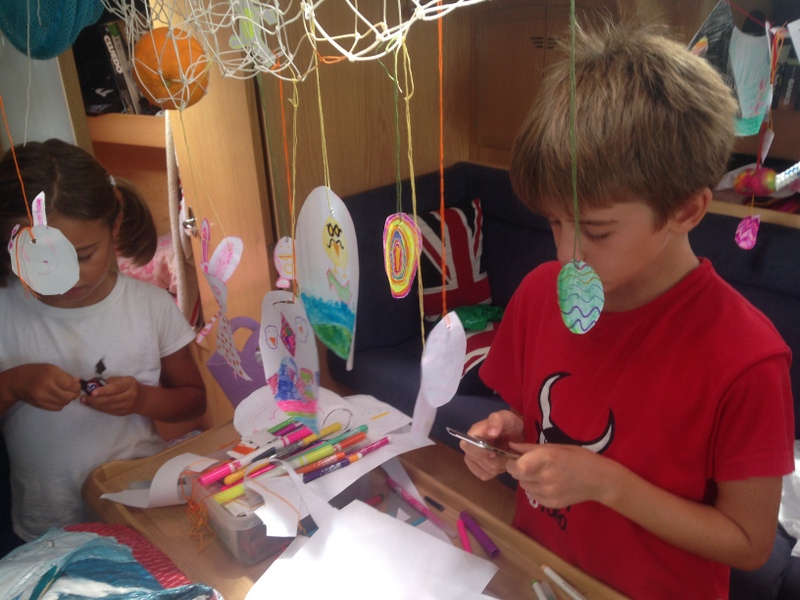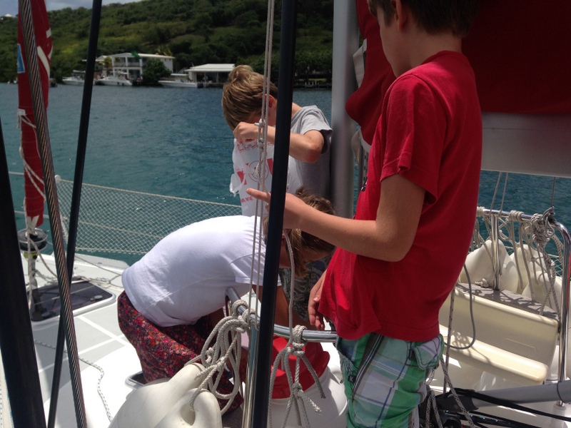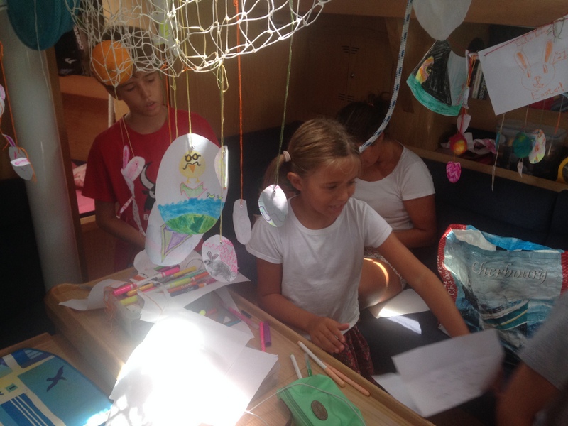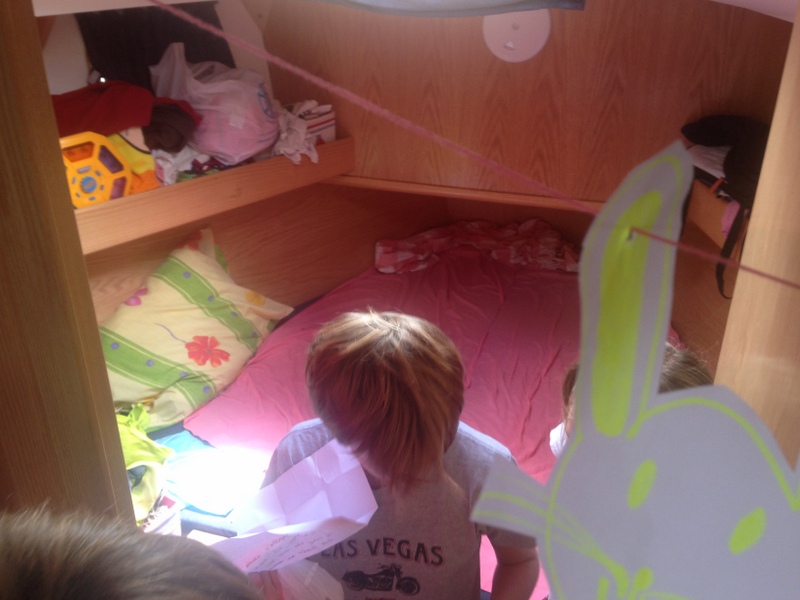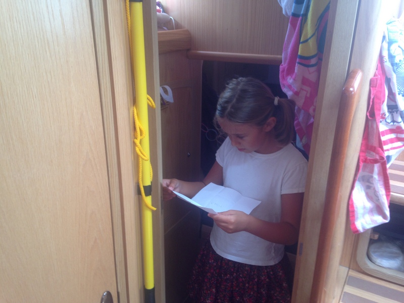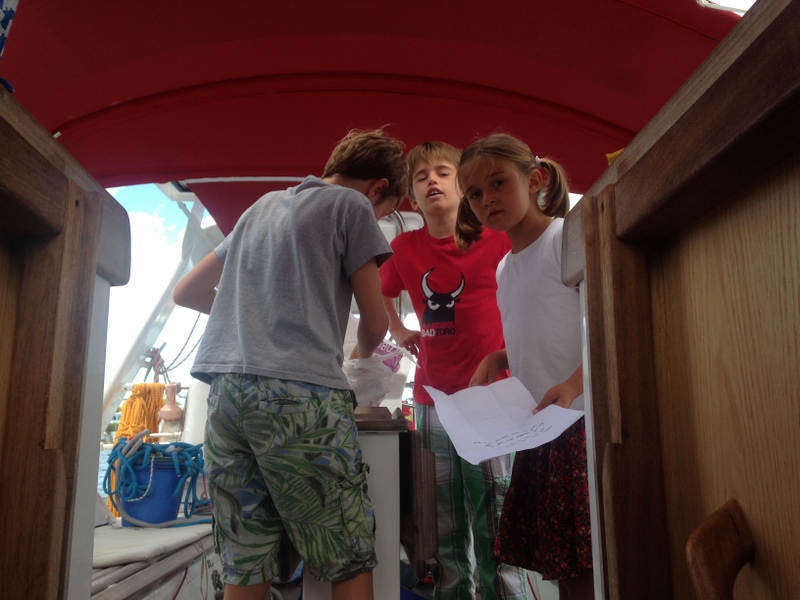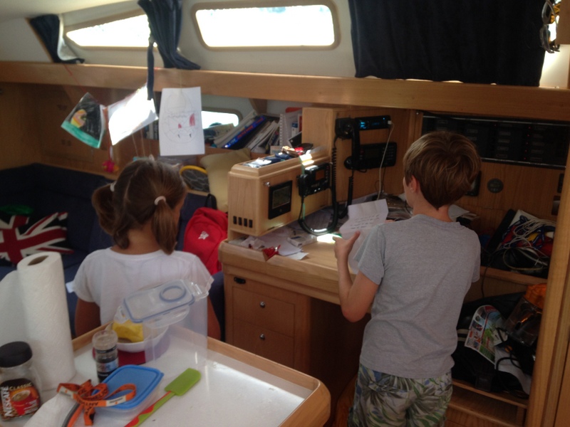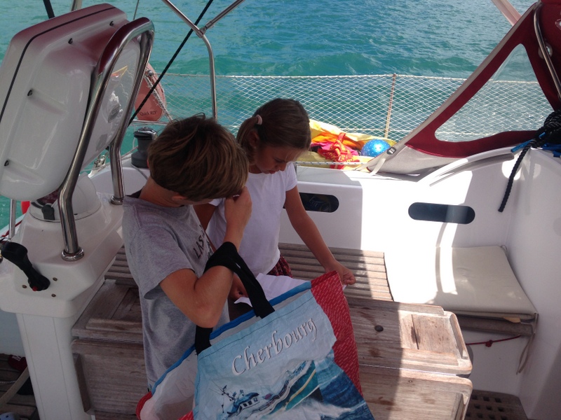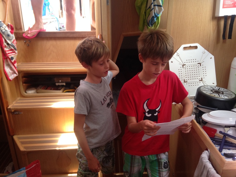Très important: faire une liste de stockage d’ingrédients pour savoir où ils sont. Il y a tellement de choses qu ‘on oublie ou elles sont, du genre où sont les boîtes de baked beans pour aller avec la baked potato? Et quand le bateau bouge, roule et tangue, ce n’est pas toujours drôle de commencer à tout soulever et tout sortir des coffres pour trouver LA nouvelle bouteille de ketchup. A vrai dire, pour être honnête, je n’ai pas fait de liste. En rétrospective, j’aurais du. Je le savais avant de partir mais c’est juste plus fort que moi!…(seuls les gens organisés font des listes et malheureusement, je ne suis pas de ceux-là). Heureusement que je n’ai pas le mal de mer car j’ai souvent passé la tête à l’envers pour chercher.