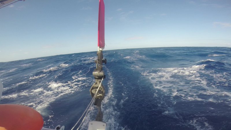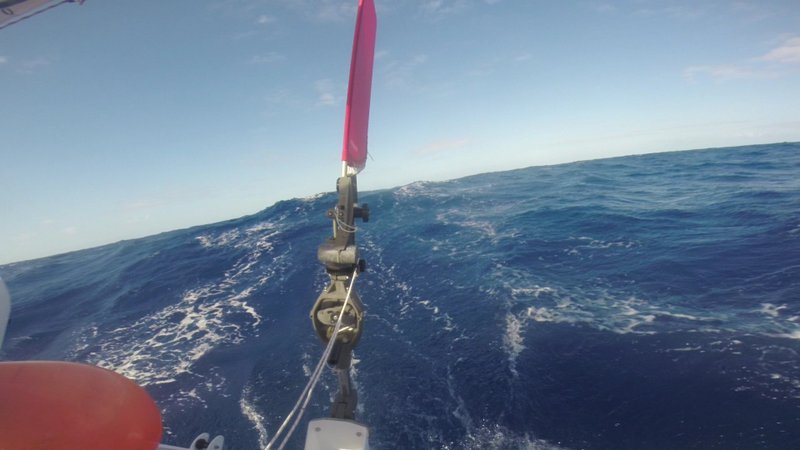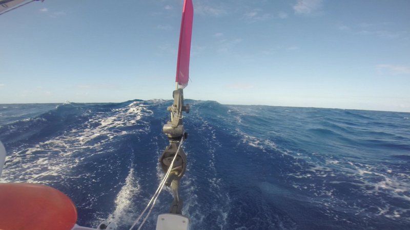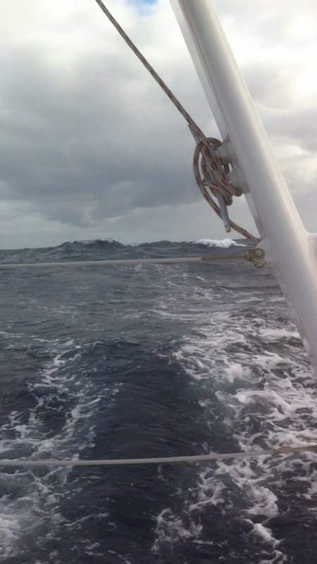 2 nuits sur trois ont été très désagréables. Vent établi à 24/25 noeuds avec creux de 4m et des vagues qui arrivent sur l’arrière, babord et tribord. On a pas mal été secoué par une mer croisée. Les enfants n’ont pas été malades, bravo à nos petits mousses.
